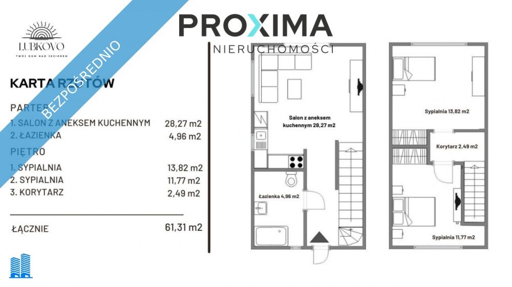 salon z aneksem kuchennym (28,27 m²), łazienka z oknem (4,96 m²), wiatrołap.